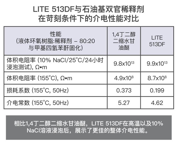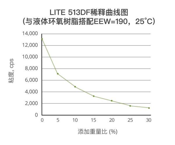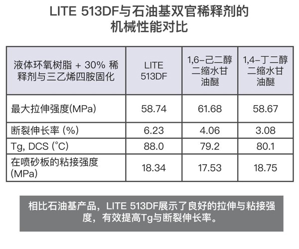 LITE 513DF是一款基于腰果殼油的新型高生物含量稀釋劑,它的環氧當量比標準的513型號要低。這款產品適用于環氧涂料、單組分和雙組分粘合劑以及復合材料。LITE 513DF粘度低,具有優異的稀釋能力,與雙酚A型液體環氧樹脂的添加重量曲線如圖所示。作為稀釋劑,它在環境溫度和低溫下具有良好的硬度發展。與其他腰果殼油改性的材料類似,LITE 513DF具有良好的耐水性和柔韌性。在涂料應用中,LITE 513DF在長期鹽霧試驗中表現出非常好的防腐性能,請見本頁面板的圖片。在粘合劑應用中,這種環氧稀釋劑還可作為改性劑,提高伸長率和粘結強度,同時將對Tg和抗拉強度的影響降至低。